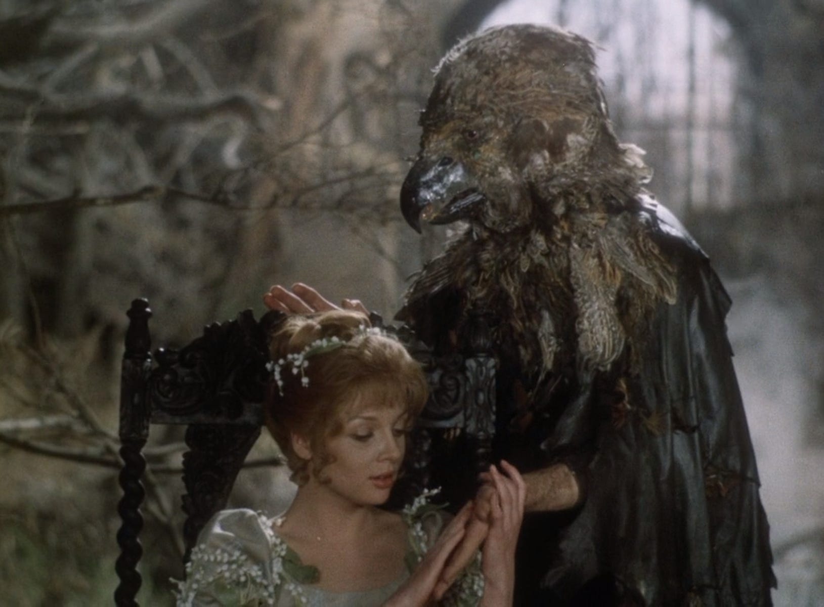 This, of course, foreshadows the appearance of the Beast, here depicted as a monstrous figure with the head of a falcon and scaly taloned hands, with a ragged cloak streaming behind him like wings. This bird-like image signals the film’s departure from the fairy tale,5 and accordingly, this is a particularly weird, complicated and tortured Beast.
