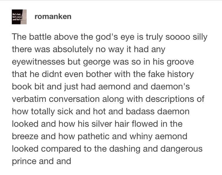 Aemond’s instability speaks to a wider issue in HotD - he is one of many characters who may be considered overly dynamic, lacking a stable foundation. This is also very obvious with his counterpart Daemon, who underwent a U-turn via magical lobotomy in Season 2, going from a selfish, impulsive sociopath to Rhaenyra’s devoted, contrite, and unquestioning malewife consort, because that’s what the plot requires him to be (and because this show is confusingly pro-monarchy except when it isn’t).