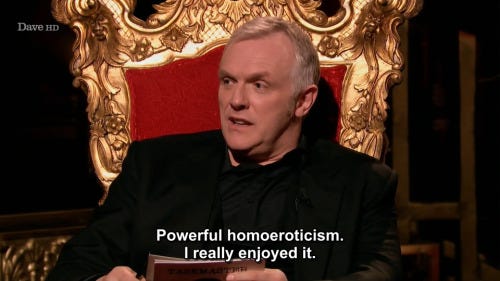 I should note, however, that the film is otherwise pretty textually gay. Although Lestat and Louis are not explicitly shown to be intimate, they are described in the same terms as you would describe a couple. Louis’ later almost-kiss with Armand also makes his orientation very clear, such that you would have to do some pretty advanced mental gymnastics to read it any other way. This was fairly boundary-pushing for the 90s, and Anne Rice even wrote a female version of Louis at one point, fearing that the film wouldn’t get made otherwise.