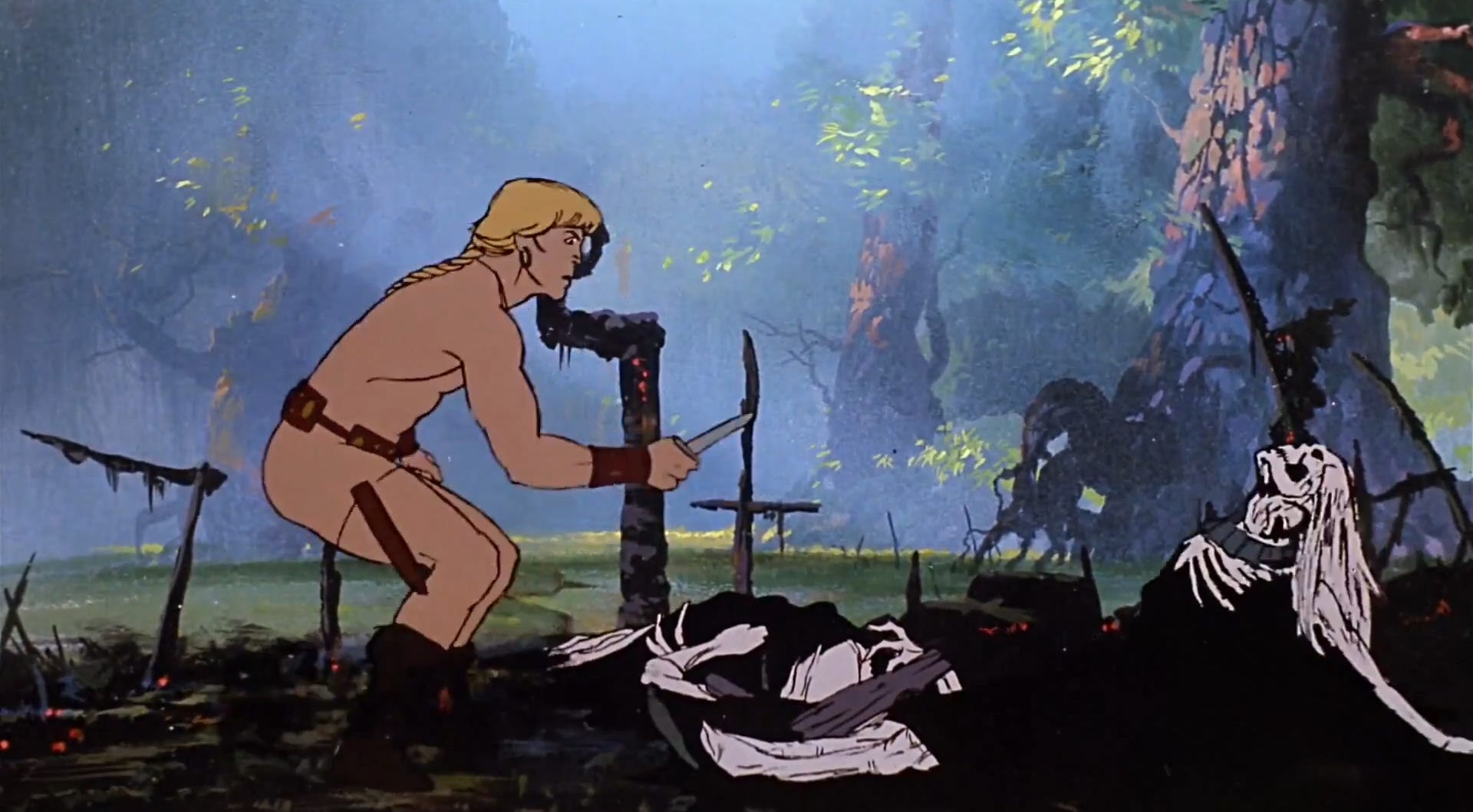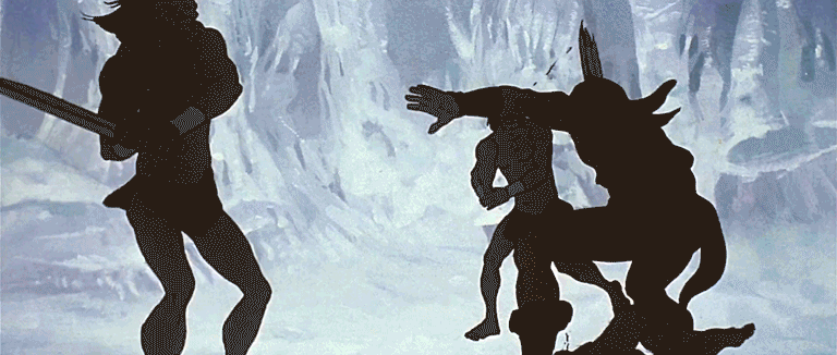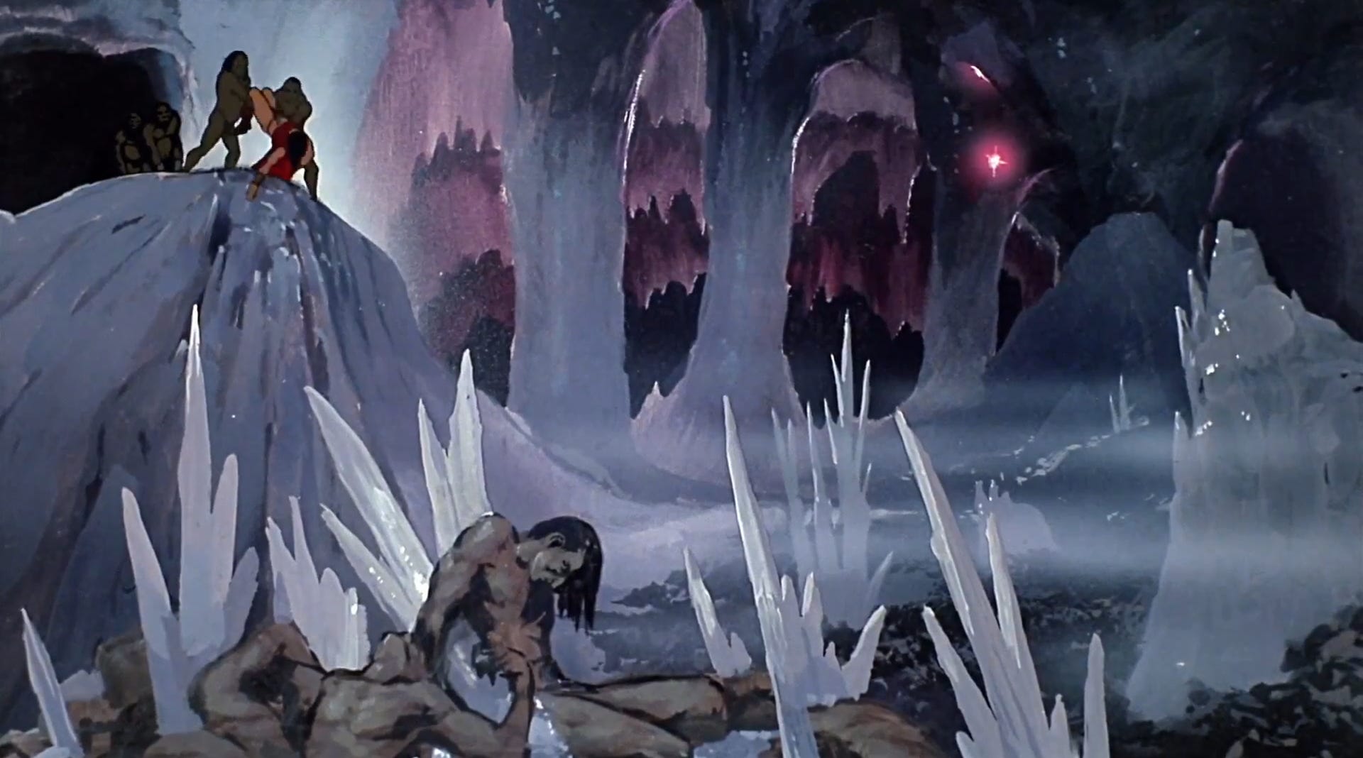 Although Fire and Ice is in some ways typical of the sword and sorcery of its time, it is atypical in terms of its overall quality, and the sheer creative spectacle that is made possible by its animated medium. Whereas Conan the Barbarian and the like had to deal with the limitations of practical effects, Fire and Ice has the most menacing ape-men you’ve ever seen, and similarly vivid pterodactyls, river monsters, and volcanic eruptions. Its fluid animation and beautiful painted backgrounds give the whole production a luxurious quality that belies its tiny budget, and the action is grippingly well-done.