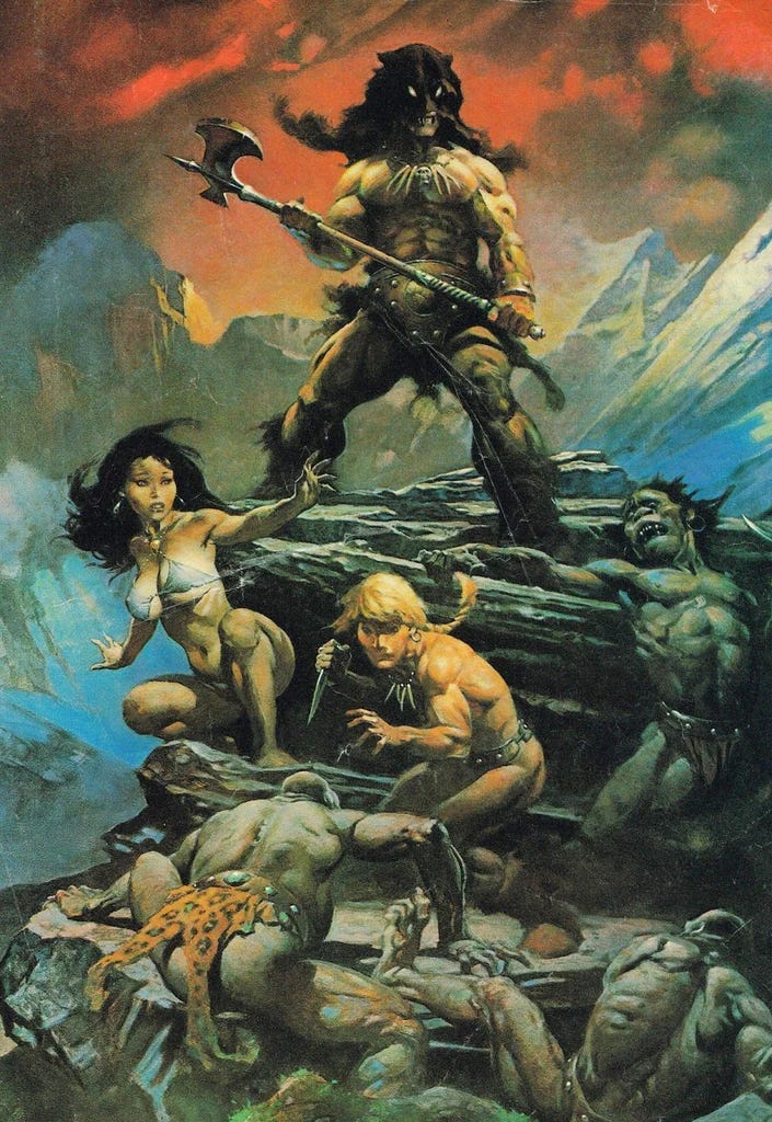 For those not au fait with commercially unsuccessful fantasy from the 80s, Fire and Ice needs some introduction. This was Ralph Bakshi’s third fantasy animation after Wizards (1977) and The Lord of the Rings (1978), both of which have been covered here before. It was also his first, and only, collaboration with the legendary artist Frank Frazetta, best known for his Conan the Barbarian paintings. As most readers will know, a Frazetta moodboard would consist largely of pictures of battle axes, snakes, dinosaurs, ape-men, muscular heroes wearing very little, and busty women somehow wearing even less.