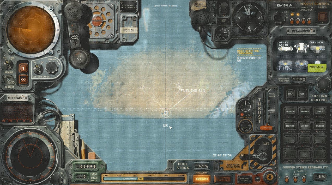 For example, the game’s introductory section spends a lot of time teaching you to use the radio to intercept signals, but no time whatsoever teaching you to launch ballistic missiles. You would think, therefore, that radio messages must be more useful than missiles: nothing could be further from the truth. Clearly, HighFleet wants you to embrace guerilla warfare and put information-gathering first, yet in actual fact the player is going to end up fighting enemy fleets sooner or later, and ought to know how to do that. The mobile enemy fleets (called strike groups) are finite in number, and traversing Gerat becomes far less daunting once a few have been knocked out. Moreover, you can quite feasibly complete a whole playthrough without bothering to engage with the radio interception system. Strictly speaking, it’s much, much more useful to know how to deploy bombers and missiles, yet if you want to do that, you might just end up consulting the manual.