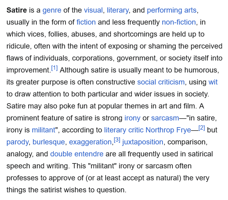 However, we are not talking about art in general here. We are talking about a self-described political satire, which are almost by definition supposed to have a point, and to deliver some kind of social criticism in a funny way.
