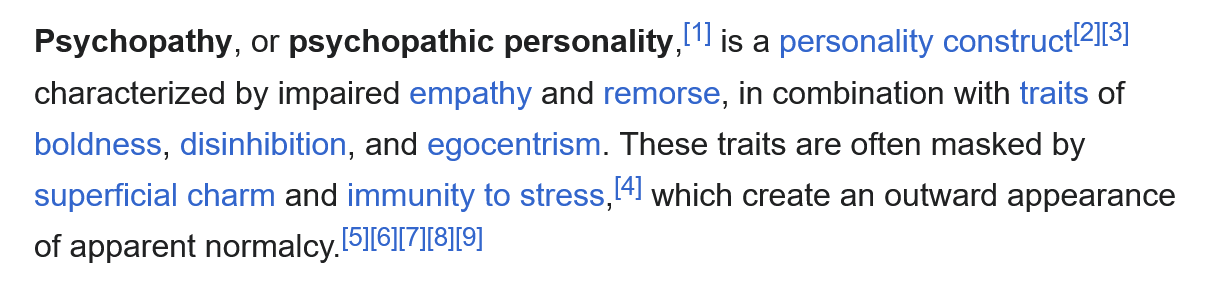 This is not to suggest that superficial charm alone is a sign of psychopathy - but when combined with low empathy (or no empathy), egoism, lack of inhibition, boldness (or ‘chutzpah’ in Gaiman’s own idiom), and cruelty, the pattern becomes pretty hard to miss. At least three of these (charm, egoism, boldness) were apparent throughout his career, i.e. long before recent revelations.